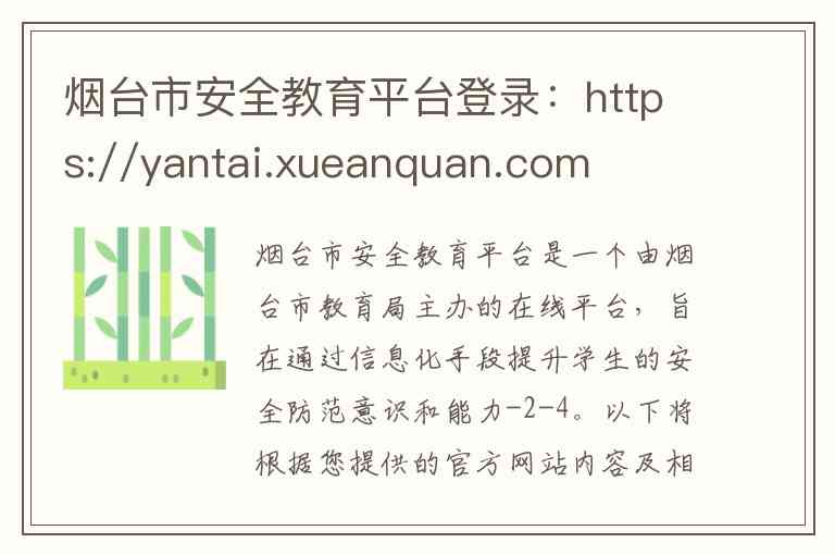 烟台市安全教育平台是一个由烟台市教育局主办的在线平台,旨在通过信息化手段提升学生的安全防范意识和能力-2-4。以下将根据您提供的官方网站内容及相关的公开信息,为您详细介绍其登录方式、主要服务内容及联系方式。