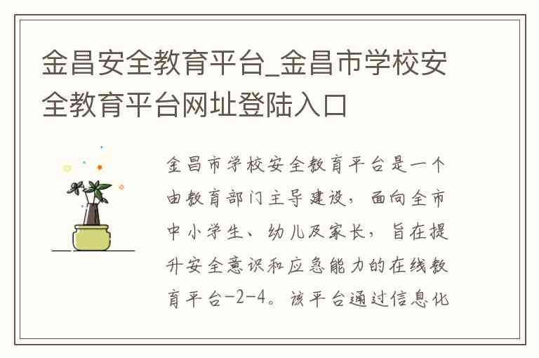 该平台由金昌市教育局主办,得到了中国教育学会的学术支持和中央电化教育馆的技术支持 -3-9。根据公开报道,该平台在金昌市覆盖了绝大多数学校,有效提升了学生的安全素养 -8。