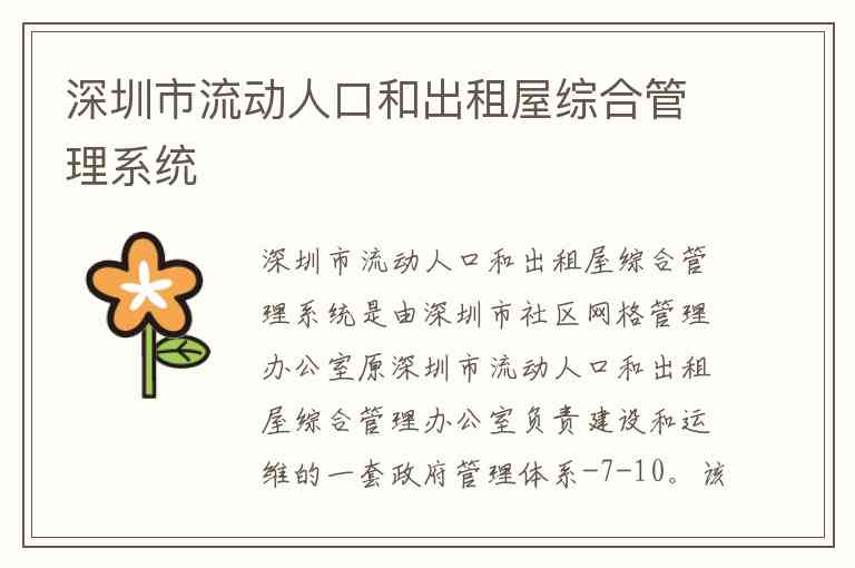 深圳市流动人口和出租屋综合管理系统是由深圳市社区网格管理办公室原深圳市流动人口和出租屋综合管理办公室负责建设和运维的一套政府管理体系-7-10。该系统通过“以房管人、人房共管”的模式,对深圳市庞大的流动人口和出租屋进行信息化、精细化服务管理-3-8。目前,原深圳市流动人口和出租屋综合信息服务网已停用,相关业务已整合至新的政务平台-1。