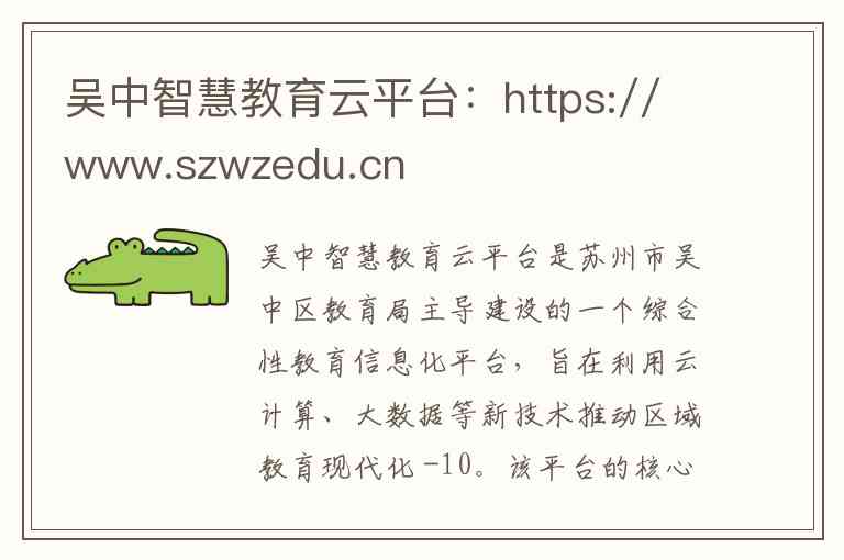 吴中智慧教育云平台是苏州市吴中区教育局主导建设的一个综合性教育信息化平台,旨在利用云计算、大数据等新技术推动区域教育现代化 -10。该平台的核心内容与服务可以从以下几个方面进行具体说明: