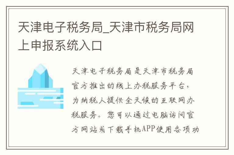 天津电子税务局的唯一官方入口是天津市税务局官方网站。您可以直接在浏览器访问天津市税务局的主页,在首页找到电子税务局的登录入口。