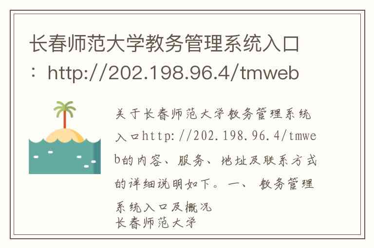 关于长春师范大学教务管理系统入口http://202.198.96.4/tmweb的内容、服务、地址及联系方式的详细说明如下。