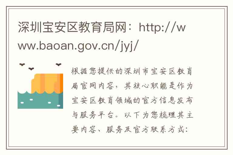 根据您提供的深圳市宝安区教育局官网内容,其核心职能是作为宝安区教育领域的官方信息发布与服务平台。以下为您梳理其主要内容、服务及官方联系方式: