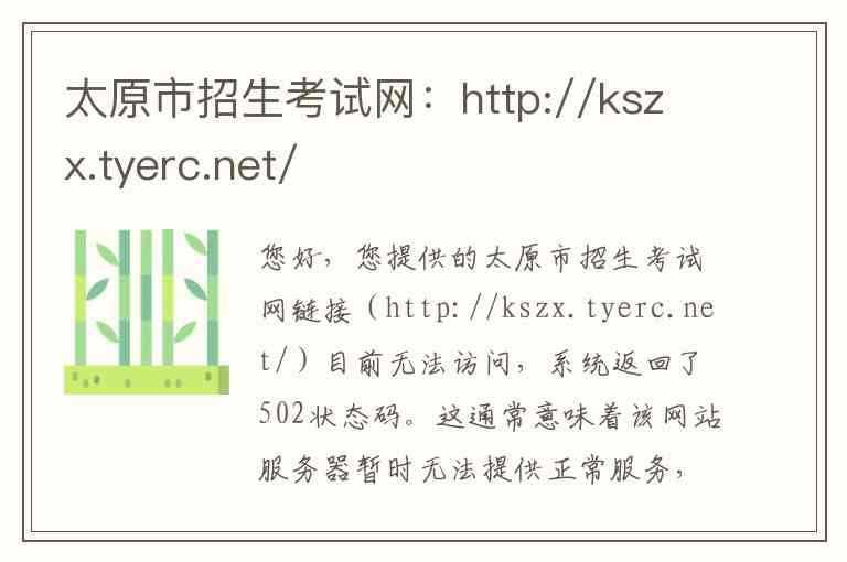 您好,您提供的太原市招生考试网链接(http://kszx.tyerc.net/)目前无法访问,系统返回了502状态码。这通常意味着该网站服务器暂时无法提供正常服务,可能正在进行维护或遇到了技术问题。