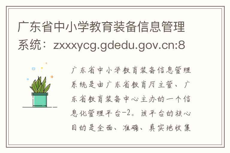 广东省中小学教育装备信息管理系统是由广东省教育厅主管、广东省教育装备中心主办的一个信息化管理平台-2。该平台的核心目的是全面、准确、真实地收集和管理全省中小学的教育装备数据,以加强教育装备的规范管理及统计,从而全面掌握装备的建设、管理与应用情况-1。