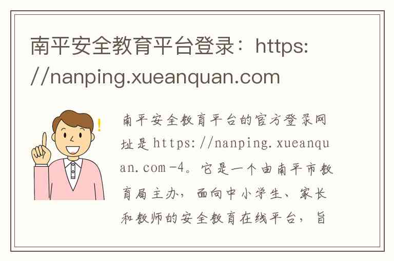 南平安全教育平台的官方登录网址是 https://nanping.xueanquan.com -4。它是一个由南平市教育局主办,面向中小学生、家长和教师的安全教育在线平台,旨在提升学生的安全意识和应急能力 -2-9。