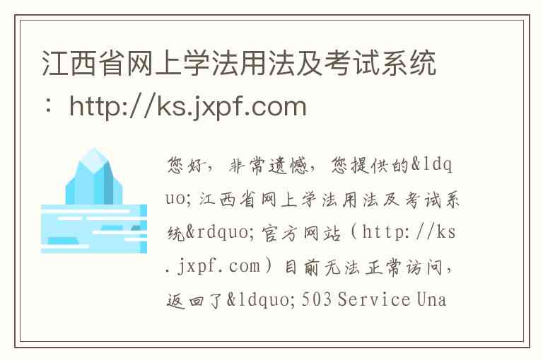 您好,非常遗憾,您提供的“江西省网上学法用法及考试系统”官方网站(http://ks.jxpf.com)目前无法正常访问,返回了“503 Service Unavailable”错误,这通常意味着服务器暂时过载或正在进行维护,暂时无法提供服务。