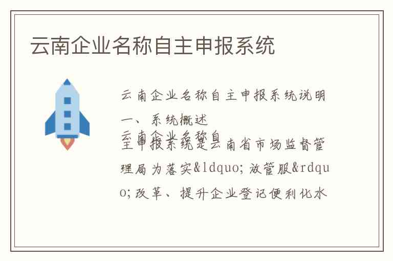 云南企业名称自主申报系统是云南省市场监督管理局为落实“放管服”改革、提升企业登记便利化水平而推出的在线政务服务平台 -9-10。该系统自2018年11月1日起在全省范围内全面实行,核心改革是取消了除涉及前置审批事项和国家市场监管总局核准以外的企业名称预先核准制度 -3-9。现在,申请人可以通过该系统自助查询、自行比对、自主选定企业名称,直接向企业登记机关申报,并自行承担相应法律责任 -3-9。