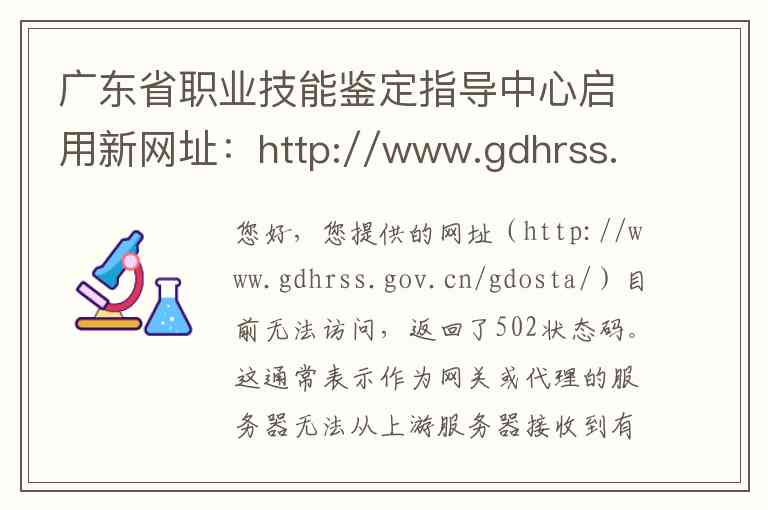 您好,您提供的网址(http://www.gdhrss.gov.cn/gdosta/)目前无法访问,返回了502状态码。这通常表示作为网关或代理的服务器无法从上游服务器接收到有效的响应,可能是网站暂时拥堵、正在维护或网址结构已发生变化。