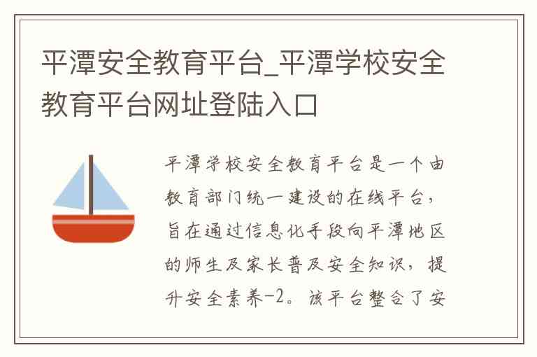 平潭学校安全教育平台是一个由教育部门统一建设的在线平台,旨在通过信息化手段向平潭地区的师生及家长普及安全知识,提升安全素养-2。该平台整合了安全课程学习、应急演练指导、家校互动等多种功能,内容覆盖防溺水、交通、消防、网络安全等多个主题-2。