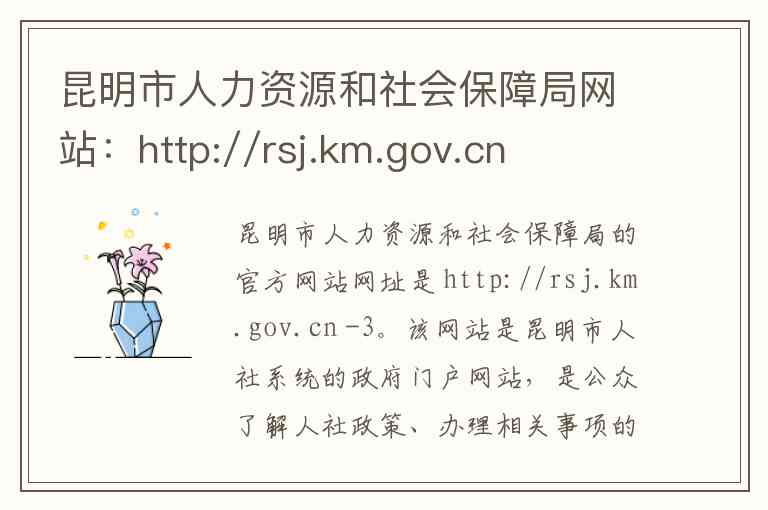 昆明市人力资源和社会保障局的官方网站网址是 http://rsj.km.gov.cn -3。该网站是昆明市人社系统的政府门户网站,是公众了解人社政策、办理相关事项的官方网络平台 -10。网站以宣传人力资源社会保障法律法规、统筹城乡就业、完善社会保障体系、维护劳动者合法权益为核心 -10。