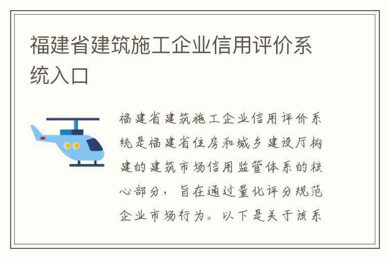 福建省建筑施工企业信用评价系统是福建省住房和城乡建设厅构建的建筑市场信用监管体系的核心部分,旨在通过量化评分规范企业市场行为。以下是关于该系统的入口地址、核心服务内容及官方联系方式的详细说明。