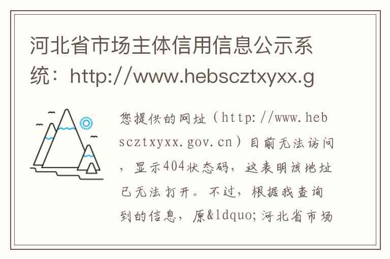 您提供的网址(http://www.hebscztxyxx.gov.cn)目前无法访问,显示404状态码,这表明该地址已无法打开。不过,根据我查询到的信息,原“河北省市场主体信用信息公示系统”的服务和内容已经进行了迁移和整合。以下是关于该系统及其相关服务的详细说明,包括准确的入口地址、核心服务内容以及官方的联系方式。