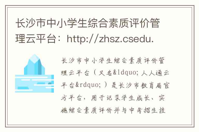 长沙市中小学生综合素质评价管理云平台(又名“人人通云平台”)是长沙市教育局官方平台,用于记录学生成长、实施综合素质评价并与中考招生挂钩。以下为您梳理其核心内容、服务及联系方式。