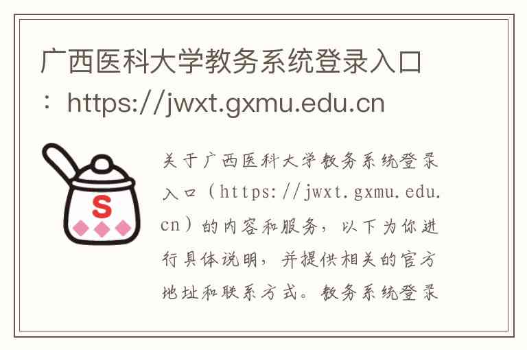 关于广西医科大学教务系统登录入口(https://jwxt.gxmu.edu.cn)的内容和服务,以下为你进行具体说明,并提供相关的官方地址和联系方式。