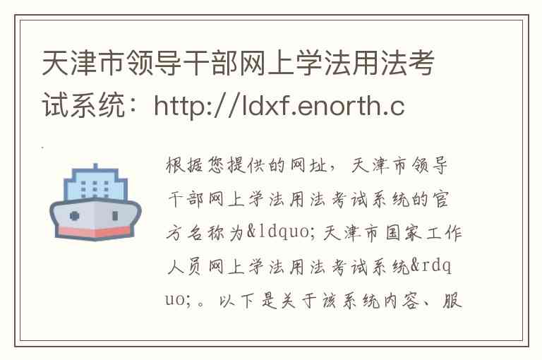 根据您提供的网址,天津市领导干部网上学法用法考试系统的官方名称为“天津市国家工作人员网上学法用法考试系统”。以下是关于该系统内容、服务及联系方式的详细说明。