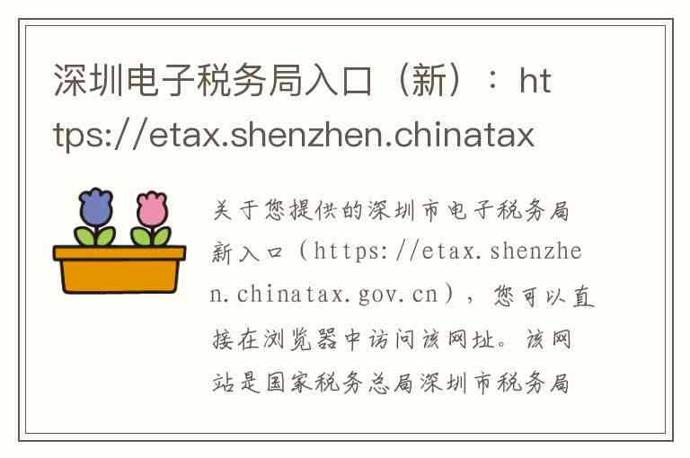 关于您提供的深圳市电子税务局新入口(https://etax.shenzhen.chinatax.gov.cn),您可以直接在浏览器中访问该网址。该网站是国家税务总局深圳市税务局官方设立的线上办税服务平台,为纳税人提供全天候的税费办理和相关服务。