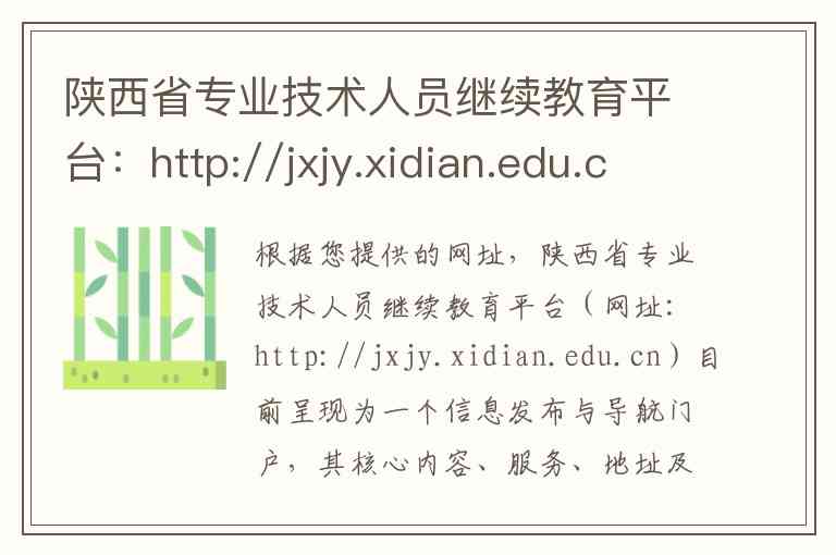根据您提供的网址,陕西省专业技术人员继续教育平台(网址:http://jxjy.xidian.edu.cn)目前呈现为一个信息发布与导航门户,其核心内容、服务、地址及联系方式详情如下。