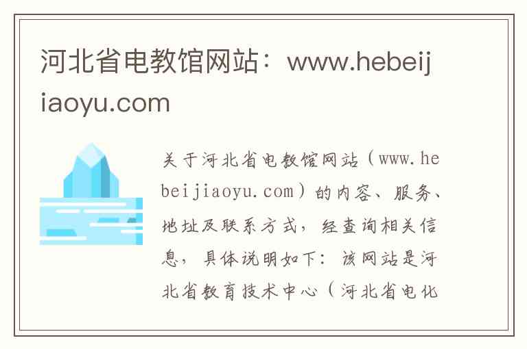 关于河北省电教馆网站(www.hebeijiaoyu.com)的内容、服务、地址及联系方式,经查询相关信息,具体说明如下:
