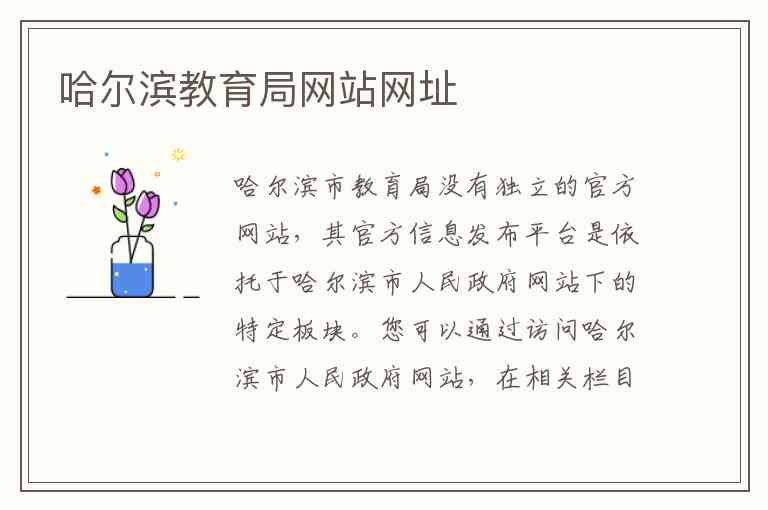 哈尔滨市教育局没有独立的官方网站,其官方信息发布平台是依托于哈尔滨市人民政府网站下的特定板块。您可以通过访问哈尔滨市人民政府网站,在相关栏目中找到哈尔滨市教育局主动公开的各类政府信息-2。