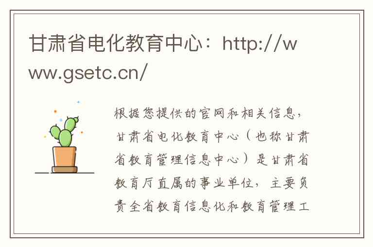 根据您提供的官网和相关信息,甘肃省电化教育中心(也称甘肃省教育管理信息中心)是甘肃省教育厅直属的事业单位,主要负责全省教育信息化和教育管理工作。以下为您详细说明其内容和服务,并提供准确的地址和联系方式。