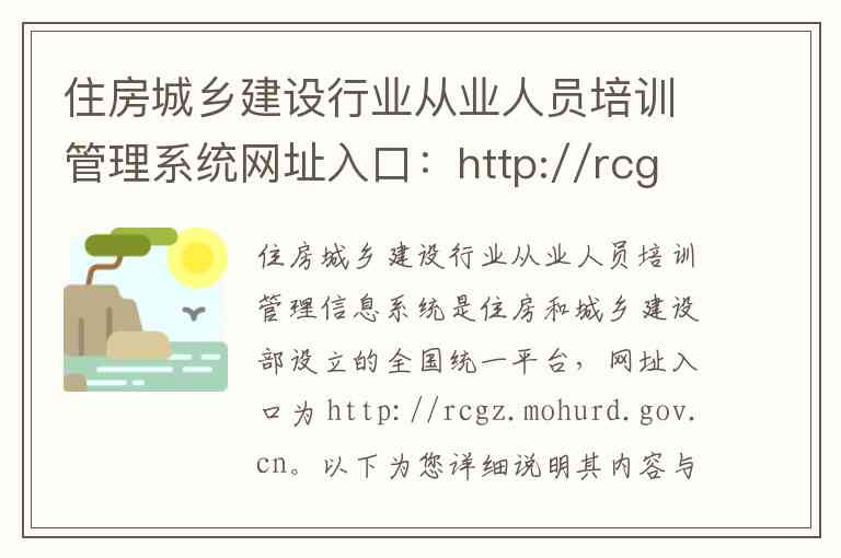 住房城乡建设行业从业人员培训管理信息系统是住房和城乡建设部设立的全国统一平台,网址入口为 http://rcgz.mohurd.gov.cn。以下为您详细说明其内容与服务,并提供相关地址和联系方式。