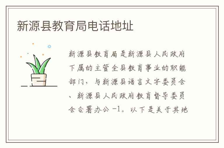 新源县教育局是新源县人民政府下属的主管全县教育事业的职能部门,与新源县语言文字委员会、新源县人民政府教育督导委员会合署办公 -1。以下是关于其地址、联系方式、主要职责及服务内容的详细说明。