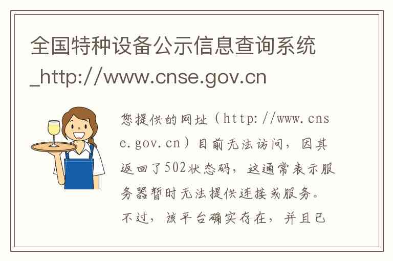 您提供的网址(http://www.cnse.gov.cn)目前无法访问,因其返回了502状态码,这通常表示服务器暂时无法提供连接或服务。不过,该平台确实存在,并且已经迁移至新的官方域名。以下是根据公开信息整理的有关“全国特种设备公示信息查询平台”的详细介绍。