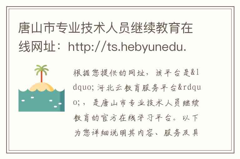 根据您提供的网址,该平台是“河北云教育服务平台”,是唐山市专业技术人员继续教育的官方在线学习平台。以下为您详细说明其内容、服务及具体联系方式。