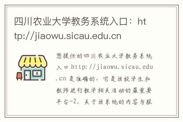 您提供的四川农业大学教务系统入口 http://jiaowu.sicau.edu.cn 是准确的,它是该校学生和教师进行教学相关活动的最重要平台-2。关于该系统的内容与服务,以及相关的地址和联系方式,为您具体说明如下: