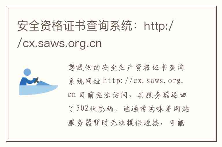 您提供的安全生产资格证书查询系统网址 http://cx.saws.org.cn 目前无法访问,其服务器返回了502状态码。这通常意味着网站服务器暂时无法提供连接,可能是由于维护、过载或技术故障导致,建议您稍后再试。