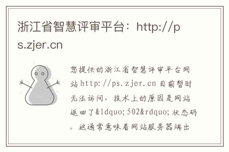 您提供的浙江省智慧评审平台网站 http://ps.zjer.cn 目前暂时无法访问,技术上的原因是网站返回了“502”状态码。这通常意味着网站服务器端出现了临时问题,比如过载或维护,导致无法正常显示网页。