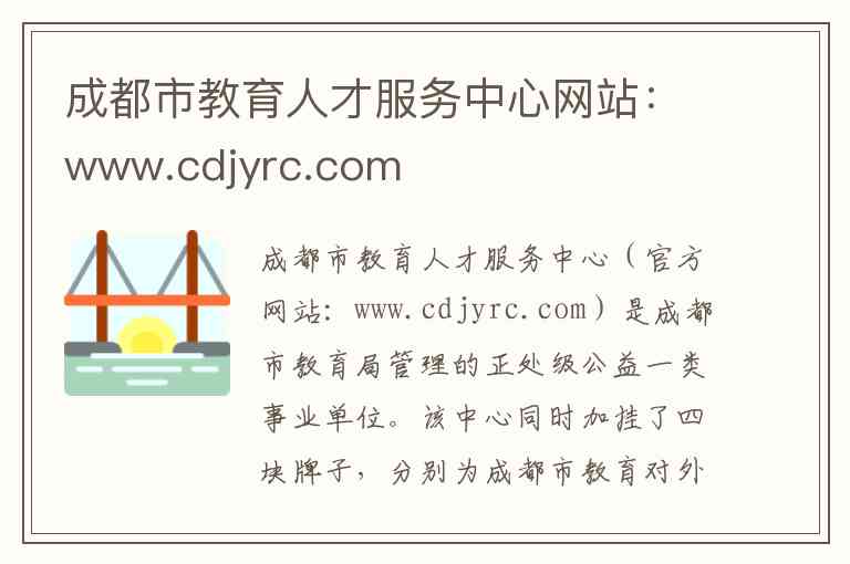 成都市教育人才服务中心(官方网站:www.cdjyrc.com)是成都市教育局管理的正处级公益一类事业单位。该中心同时加挂了四块牌子,分别为成都市教育对外交流中心、成都市普通话水平测试中心、成都教育政务新媒体中心以及成都市教师共享中心-1-4。