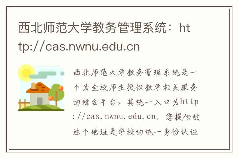 西北师范大学教务管理系统是一个为全校师生提供教学相关服务的综合平台,其统一入口为http://cas.nwnu.edu.cn。您提供的这个地址是学校的统一身份认证平台,它是访问包括教务系统在内的所有校内网络服务的“总门户”和“通行证”-3-5。