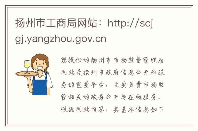 您提供的扬州市市场监督管理局网站是扬州市政府信息公开和服务的重要平台,主要负责市场监管相关的政务公开与在线服务。根据网站内容,其基本信息如下