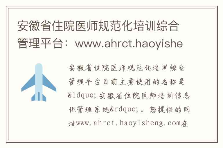 安徽省住院医师规范化培训综合管理平台目前主要使用的名称是“安徽省住院医师培训信息化管理系统”。您提供的网址www.ahrct.haoyisheng.com在搜索结果中未出现,实际有效的系统访问地址为http://39.145.8.9:9889/ -1。