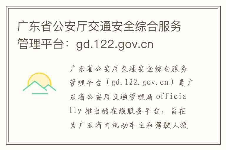 广东省公安厅交通安全综合服务管理平台(gd.122.gov.cn)是广东省公安厅交通管理局 officially 推出的在线服务平台,旨在为广东省内机动车主和驾驶人提供便捷的交通管理业务办理与信息服务。该平台整合了车辆、驾驶证、违法处理等多方面业务,实现从查询到办理的一站式服务。