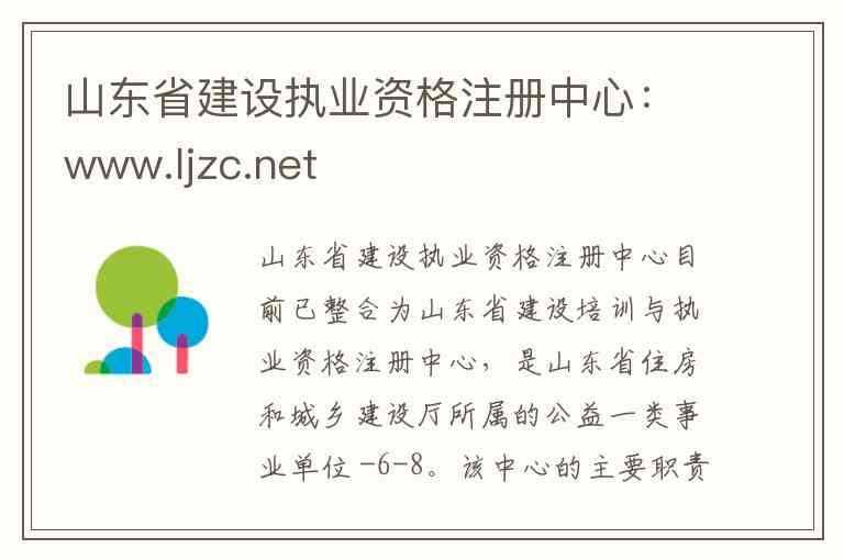 山东省建设执业资格注册中心目前已整合为山东省建设培训与执业资格注册中心,是山东省住房和城乡建设厅所属的公益一类事业单位 -6-8。该中心的主要职责是负责建设行业相关执业资格考试、注册和从业人员业务评价工作,开展建设领域从业人员继续教育相关工作,并承担省住房城乡建设厅信息化建设和电子政务平台运行维护的技术支撑工作 -1-3-8。