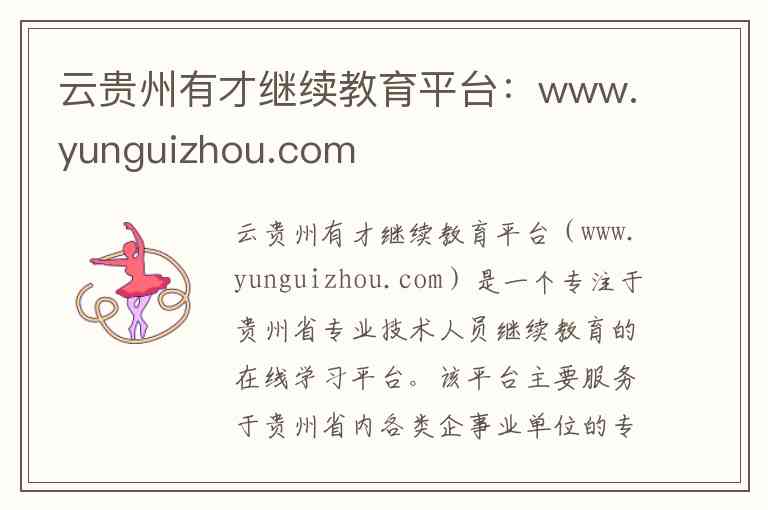 云贵州有才继续教育平台(www.yunguizhou.com)是一个专注于贵州省专业技术人员继续教育的在线学习平台。该平台主要服务于贵州省内各类企事业单位的专业技术人员,提供公需科目和专业科目的在线学习、考试及学时登记服务。