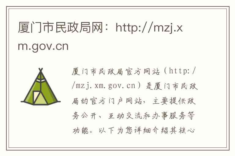 厦门市民政局官方网站(http://mzj.xm.gov.cn)是厦门市民政局的官方门户网站,主要提供政务公开、互动交流和办事服务等功能。以下为您详细介绍其核心内容与服务,并提供详细的地址与联系方式。