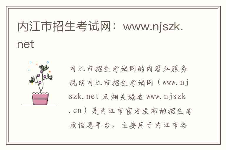 内江市招生考试网(www.njszk.net 及相关域名 www.njszk.cn)是内江市官方发布的招生考试信息平台,主要用于内江市各类重要教育考试的网上报名、缴费、志愿填报及政策信息查询等服务-3-5。该网站的主要服务对象涵盖全市中考考生、高考考生、社会考生以及自考学生等-2-6-8。