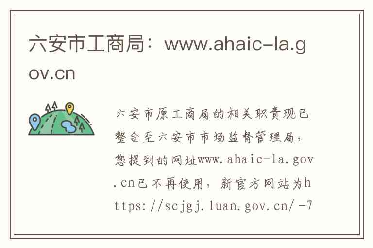 六安市原工商局的相关职责现已整合至六安市市场监督管理局,您提到的网址www.ahaic-la.gov.cn已不再使用,新官方网站为https://scjgj.luan.gov.cn/ -7-10。以下为您详细介绍其内容服务与联系方式。