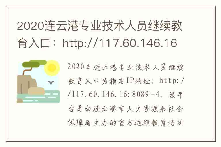 2020年连云港专业技术人员继续教育入口为指定IP地址:http://117.60.146.16:8089 -4。该平台是由连云港市人力资源和社会保障局主办的官方远程教育培训网站,旨在为全市专业技术人员提供便捷的在线学习服务 -3。