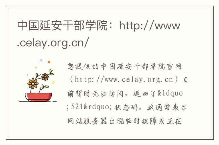 您提供的中国延安干部学院官网(http://www.celay.org.cn)目前暂时无法访问,返回了“521”状态码。这通常表示网站服务器出现临时故障或正在进行维护。