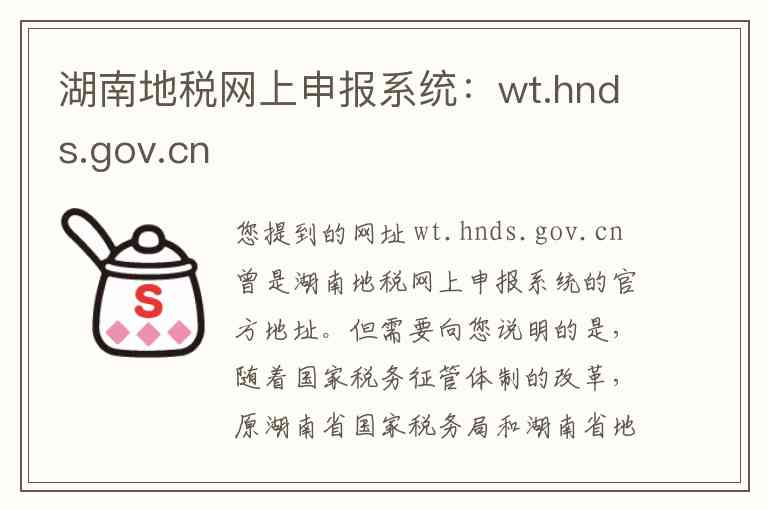 您提到的网址 wt.hnds.gov.cn 曾是湖南地税网上申报系统的官方地址。但需要向您说明的是,随着国家税务征管体制的改革,原湖南省国家税务局和湖南省地方税务局已合并,该系统已停止使用,其功能和服务已整体升级为“国家税务总局湖南省电子税务局”。您咨询的原网站已不再对外服务。