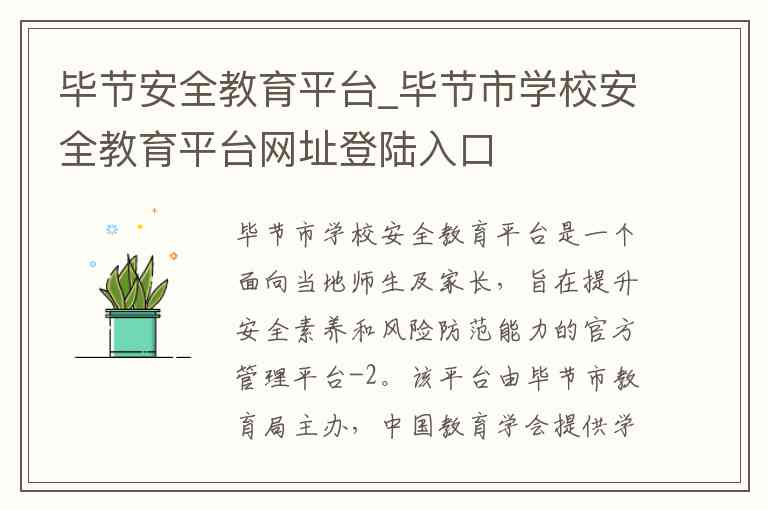 毕节市学校安全教育平台是一个面向当地师生及家长,旨在提升安全素养和风险防范能力的官方管理平台-2。该平台由毕节市教育局主办,中国教育学会提供学术支持,中央电化教育馆提供技术支持-4。