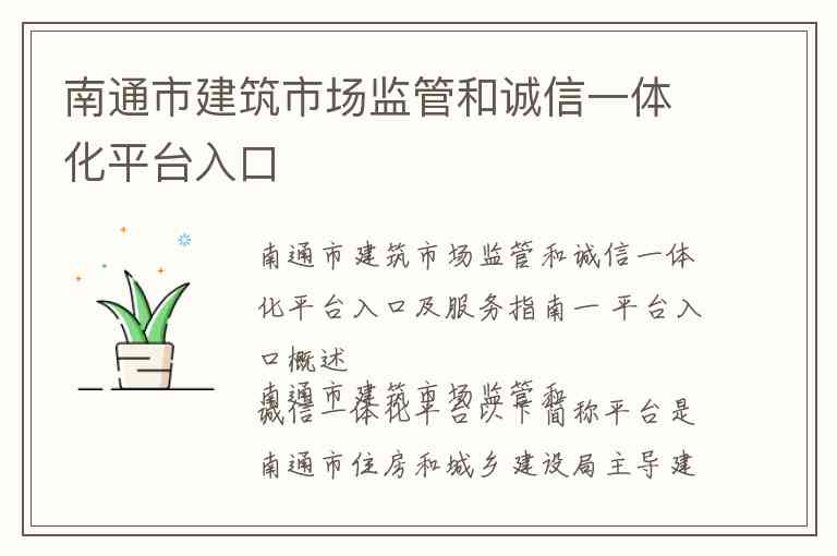 南通市建筑市场监管和诚信一体化平台以下简称平台是南通市住房和城乡建设局主导建设的用于建筑市场监管与企业信用评价的综合性线上服务平台。该平台主要通过互联网访问通常入口位于南通市住房和城乡建设局官方网站或相关政务服务网链接但由于系统采用加密锁登录机制具体登录页面地址通常不直接公开而是面向已注册并获取权限的企业用户提供访问通道-1-3。