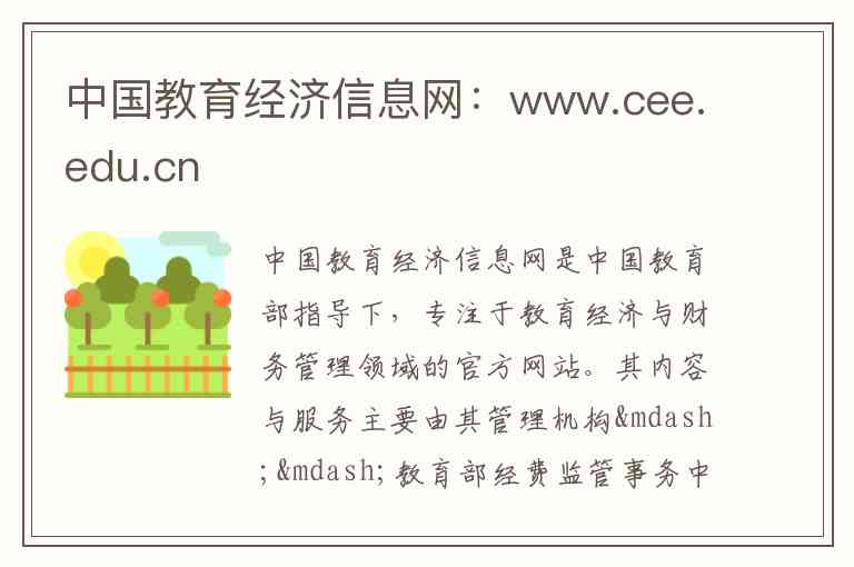 中国教育经济信息网是中国教育部指导下,专注于教育经济与财务管理领域的官方网站。其内容与服务主要由其管理机构——教育部经费监管事务中心负责,旨在构建教育经济数据资源集成平台,为教育财务管理科学决策提供信息支持和服务-1。
