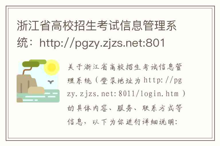 关于浙江省高校招生考试信息管理系统(登录地址为 http://pgzy.zjzs.net:8011/login.htm )的具体内容、服务、联系方式等信息,以下为你进行详细说明:
