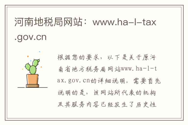 根据您的要求,以下是关于原河南省地方税务局网站www.ha-l-tax.gov.cn的详细说明。需要首先说明的是,该网站所代表的机构及其服务内容已经发生了历史性变更。2018年6月15日,原河南省国家税务局和原河南省地方税务局正式合并,组建为国家税务总局河南省税务局-8。因此,原河南省地方税务局网站已停止使用,其职能和服务已由全新的国家税务总局河南省税务局门户网站承接。